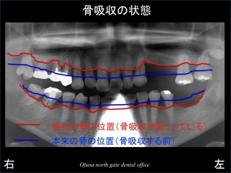 いつものように 骨吸収の状態を分かりやすくするために 骨吸収の状態を線で書いたのが以下のレントゲンになります。