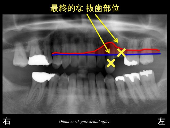 最終的な治療計画は、2歯を抜歯し、手前の歯は徹底した歯周病治療 と噛み合わせの治療を行い、保存することになりました。