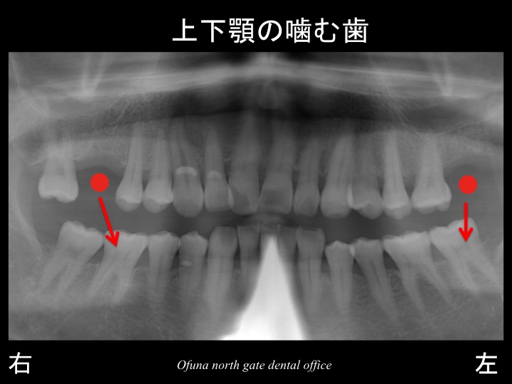 下のレントゲン写真は、上下顎の歯が噛み合っている位置を表したものです。
