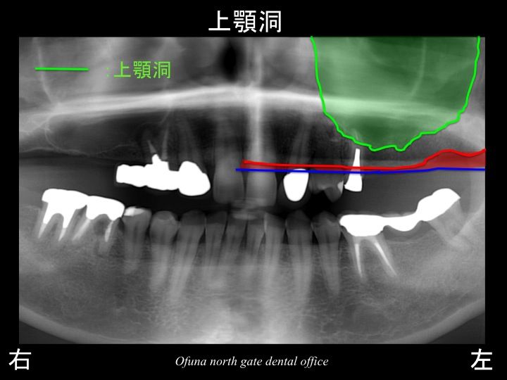 以下のレントゲンの緑線は上顎洞という空洞です。