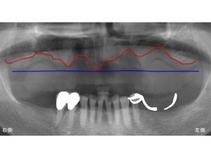 骨吸収を起こしている現在の状態を赤線で明記します。