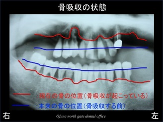 いつものように 骨吸収の状態を分かりやすくするために 骨吸収の状態を線で書いたのが以下のレントゲンになります。