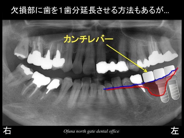 カンチレバー という方法で欠損部をどうにかする方法はあります。