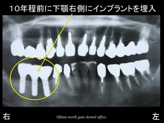 下顎右側の奥にある3本のインプラントは私が10年程前にインプラント治療を行ったものです。