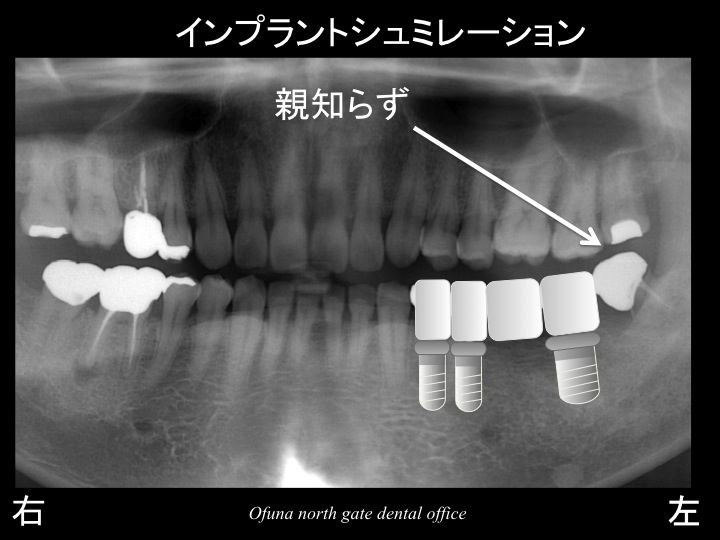 ちなみに抜歯予定であった 下顎左側の一番奥歯(親知らず)は、将来性は低いですが、患者様が抜歯をご希望されなかったこともあり、最終的には保存することになりました。