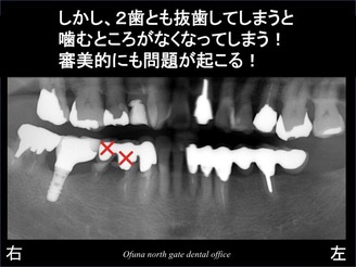 検査を行った結果、欠損している部位の両側の歯もすでにダメな状態でした。