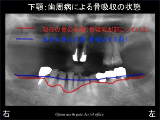 青線が骨吸収を起こす前の骨の位置です。