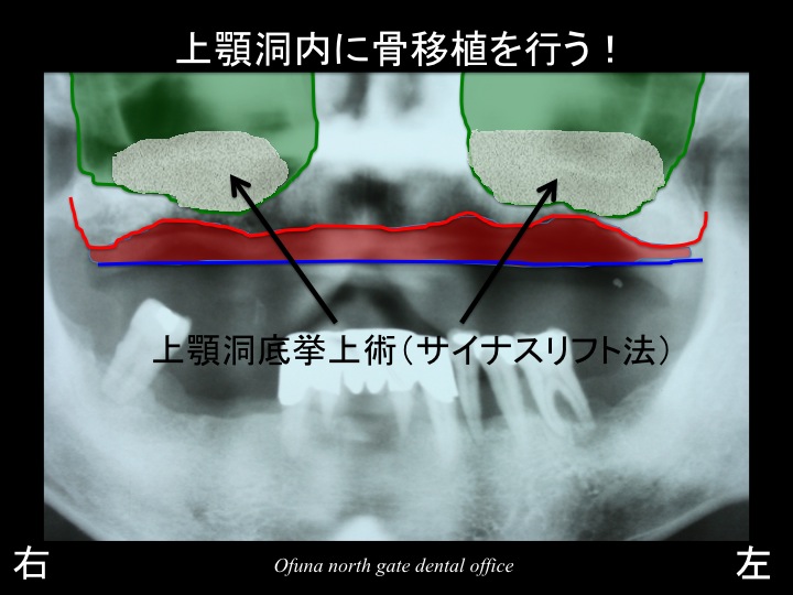 理想的には、上顎の奥歯に骨移植サイナスリフト法(上顎洞底挙上術) を行ってからインプラントを埋入することです。