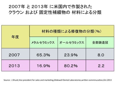 次のデータは、2013年の米国で作製された固定性補綴物の内訳です。